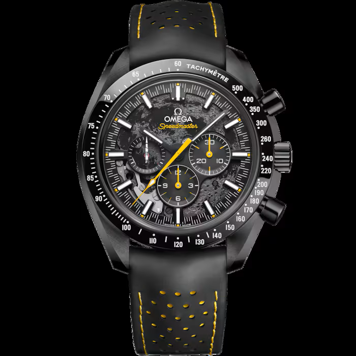 En 1968, los tripulantes del Apolo 8 se convirtieron en los primeros humanos que vieron la cara oculta de la Luna. Como homenaje, OMEGA ha creado este audaz cronógrafo de cerámica con esfera esqueleto, aguja en forma de cohete Saturno V y movimiento decorado que representa la superficie lunar.
